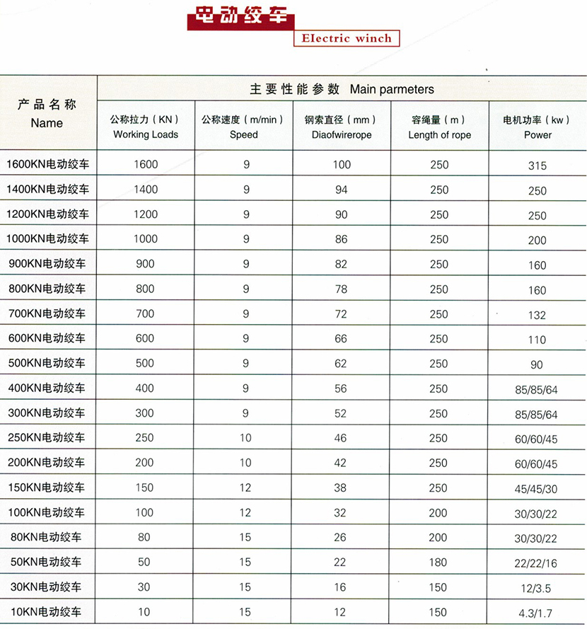 鋼索直徑: 90mm 繩容量: 250m