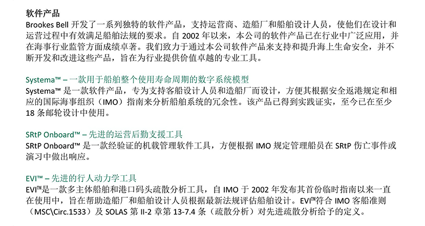 應(yīng)用目的: 支持和提升海上生命安全;幫助船舶設(shè)計(jì)符合“安全返港”要求 功能亮點(diǎn): Systema? 可模擬新造船系統(tǒng)并具體到組件層次,從而評(píng)估船舶設(shè)計(jì)是否符合“安全返港”要求;SRtP Onboard?可與Systema?配合,模擬船上系統(tǒng),指引船員依照“安全返港”要求在傷亡事故演戲中進(jìn)行操作與行動(dòng);EVI?可以模擬船上乘客撤離疏散實(shí)況,評(píng)估船舶當(dāng)前設(shè)計(jì)是否符合疏散要求,并高亮注明擁堵位置,為設(shè)計(jì)階段優(yōu)化全船布局提供參考。