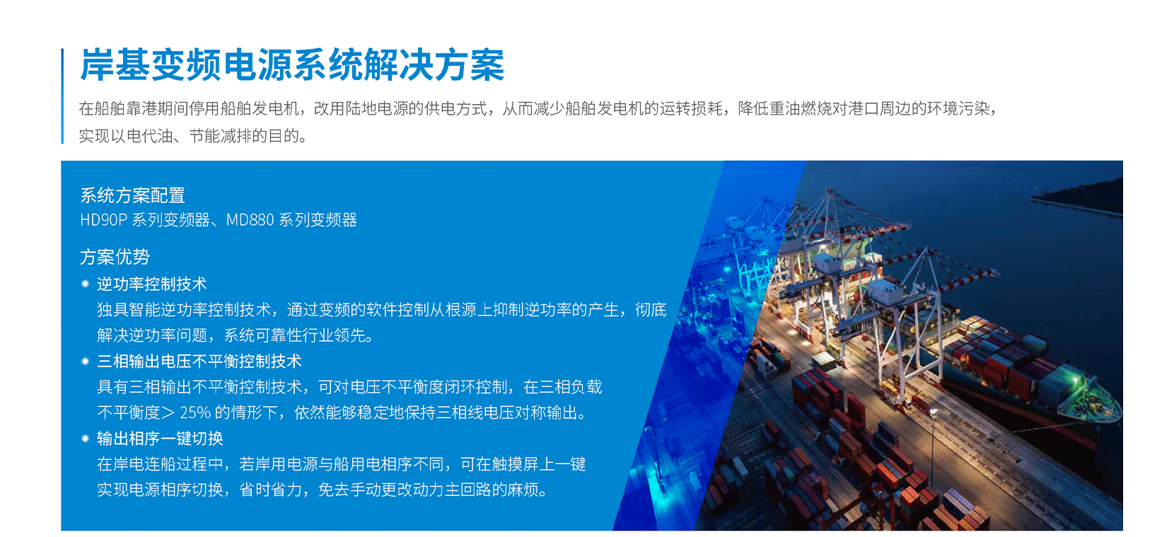 方案優(yōu)勢: 獨(dú)具智能逆功率控制技術(shù),從根源上抑制逆功率的產(chǎn)生,徹底解決逆功率問題; 具有三相輸出不平衡控制技術(shù),可對電壓不平衡度閉環(huán)控制;在岸電連船過程中,若岸用電源與船用電相序不同,可在觸摸屏上一鍵實(shí)現(xiàn)電源相序切換,省時(shí)省力